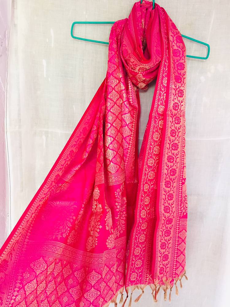 A striking Banarasi art dupatta in pink, adorned with intricate golden zari work and elegant floral motifs. Lightweight and luxurious, it elevates your festive and ethnic looks with effortless grace.