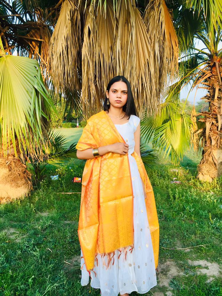A radiant Banarasi art dupatta in turmeric yellow, featuring intricate golden zari work and traditional motifs. Lightweight yet luxurious, it adds a regal charm to your ethnic wear.